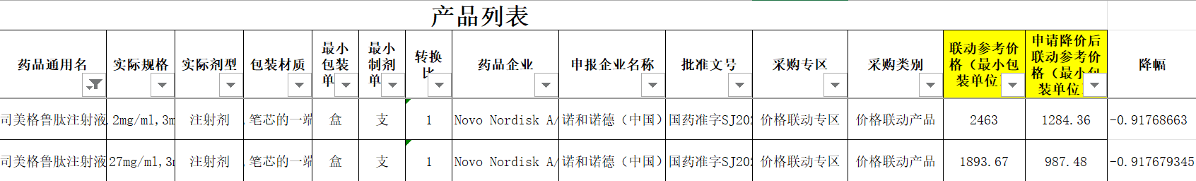 如2025年12月底,据四川省药械招采中心公示的药品降价信息,3.2mg/ml×3ml、2.27mg/ml×3ml两个规格的司美格鲁肽注射液分别降价至1284.36元/支、987.48元/支,价格几乎腰斩。
