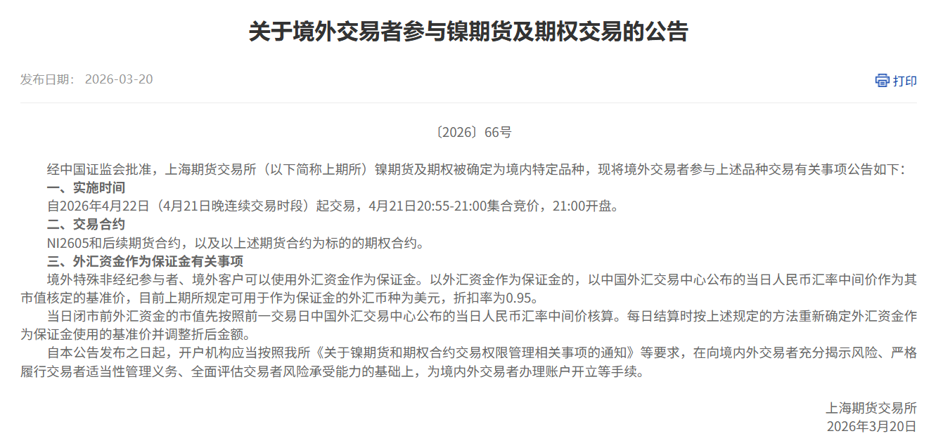 上证报中国证券网讯(记者费天元)3月20日,上海期货交易所(下称上期所)发布公告,将于4月22日(4月21日晚连续交易时段)正式引入境外交易者参与镍期货及期权交易,上述两个品种同步向合格境外投资者(QFI)开放。为确保品种平稳推出和业务稳健运行,上期所同日发布了关于上述品种引入境外交易者的公告及相关业务细则等内容。