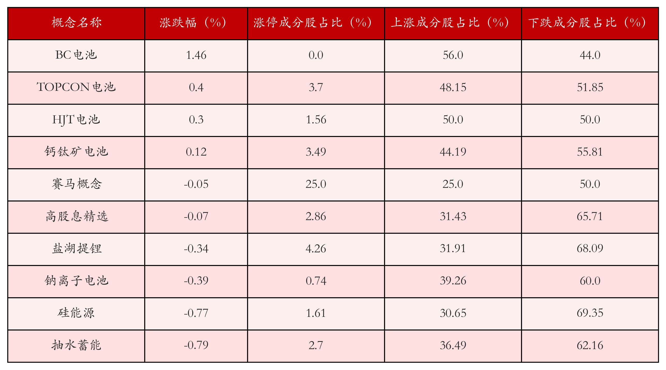 根据A股概念涨跌幅与所对应的股票池综合分析,涨幅靠前的三个概念板块分别为:BC电池、TOPCON电池与HJT电池。排名前10位的概念板块相关数据见下表: