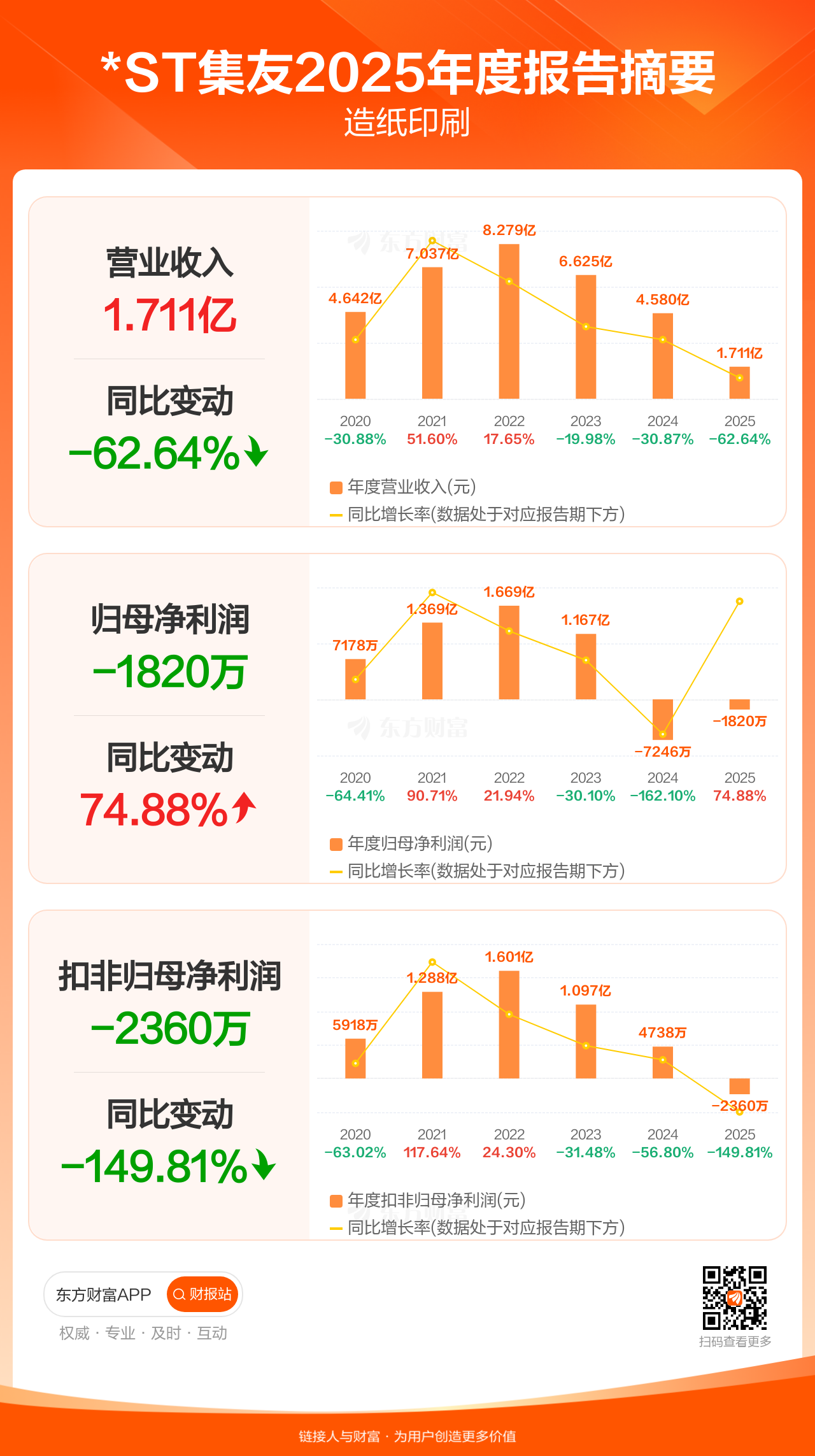 *ST集友3月21日发布2025年年报显示,公司全年实现营业收入1.71亿元,同比下滑62.64%;归母净利润-1820.48万元;扣非归母净利润-2360.27万元。