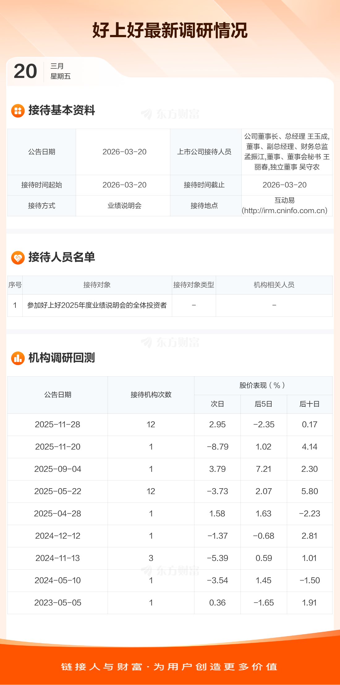 好上好3月20日公告称,3月20日接待参加好上好2025年度业绩说明会的全体投资者等1家机构调研。接待人员包括公司董事长、总经理 王玉成,董事、副总经理、财务总监 孟振江,董事、董事会秘书 王丽春,独立董事 吴守农。