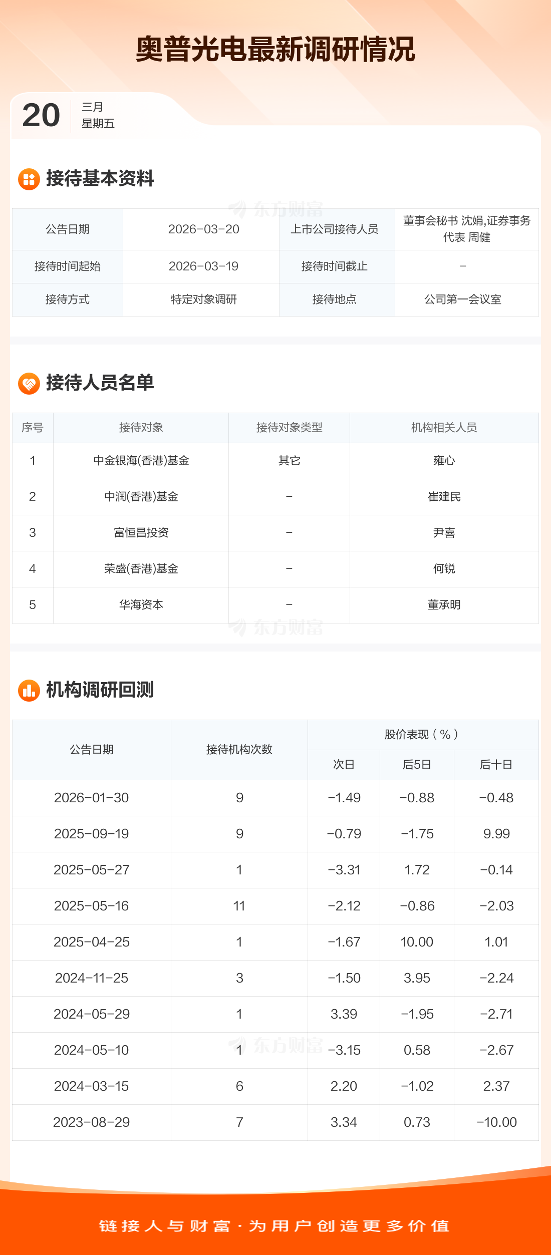 奥普光电3月20日公告称,3月19日接待中金银海(香港)基金等5家机构调研。接待人员包括董事会秘书 沈娟,证券事务代表 周健。