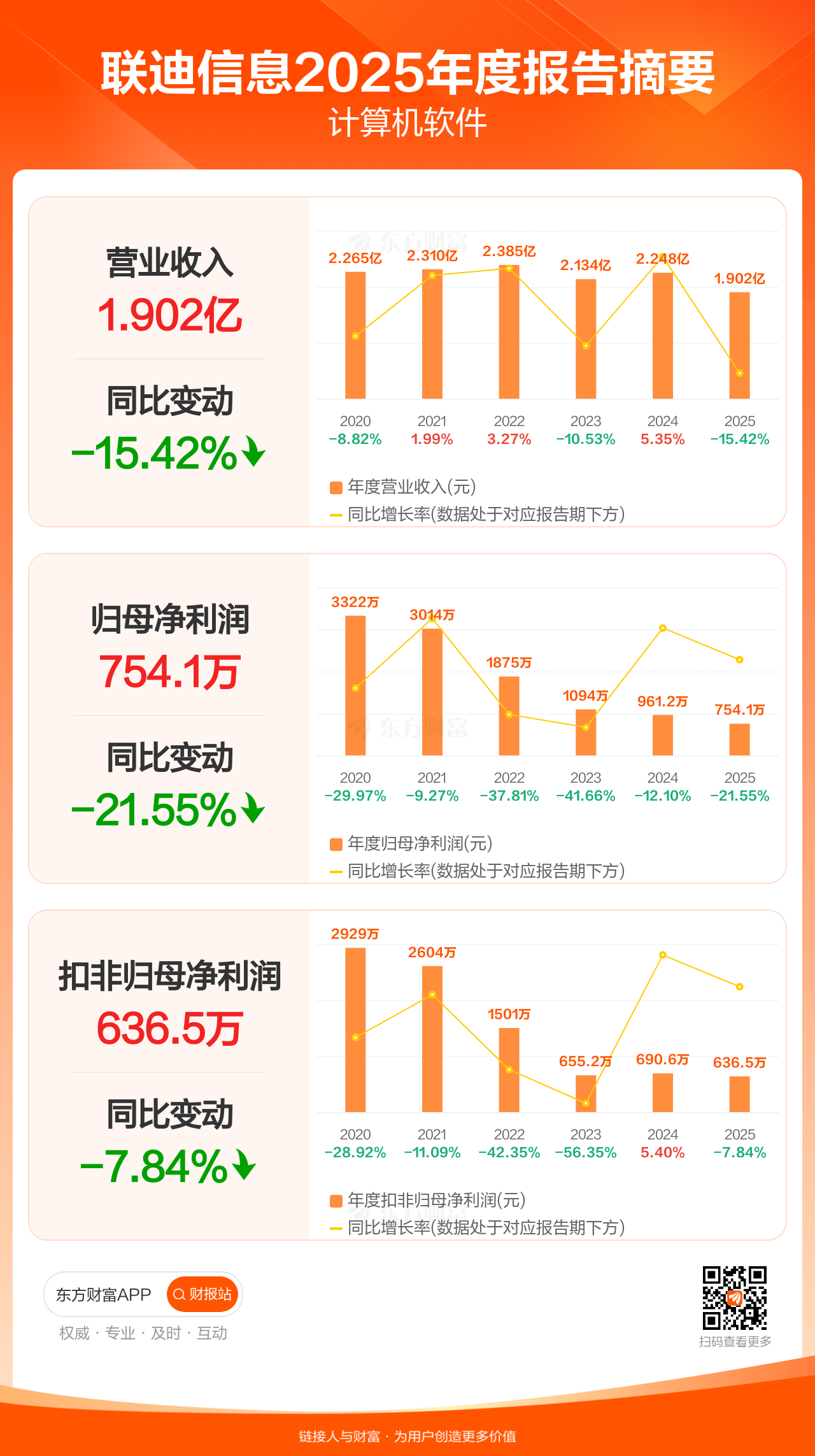 联迪信息3月20日发布2025年年报显示,公司全年实现营业收入1.90亿元,同比下滑15.42%;归母净利润754.08万元,同比下滑21.55%;扣非归母净利润636.46万元,同比下滑7.84%。
