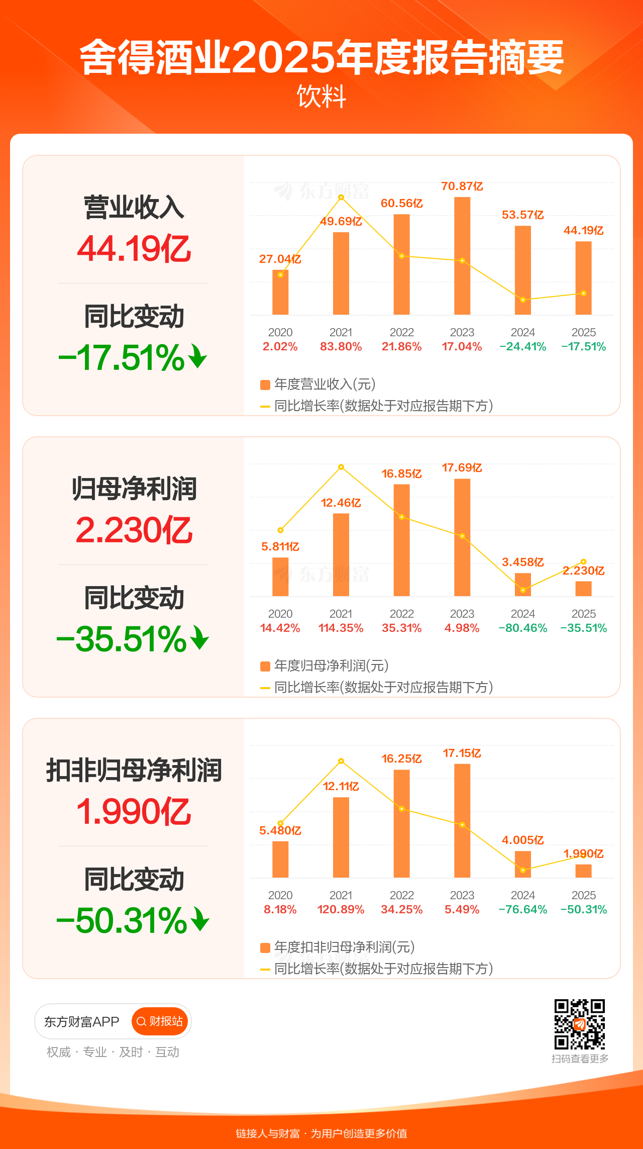 舍得酒业3月21日发布2025年年报显示,公司全年实现营业收入44.19亿元,同比下滑17.51%;归母净利润2.23亿元,同比下滑35.51%;扣非归母净利润1.99亿元,同比下滑50.31%。每股EPS0.68元,低于机构一致预测的1.29元。