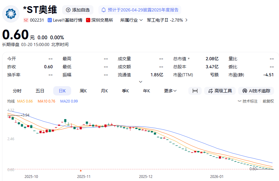 交易软件显示,*ST奥维股价报0.6元/股,总市值为2.08亿元。
