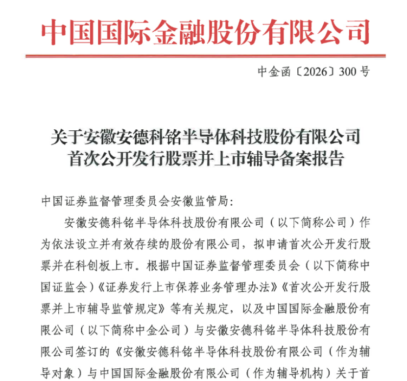 3月20日,证监会官网IPO辅导公示信息显示,安徽安德科铭半导体科技股份有限公司(下称“安德科铭”)已向安徽证监局报送IPO辅导备案材料,拟登陆科创板,辅导机构为中金公司。