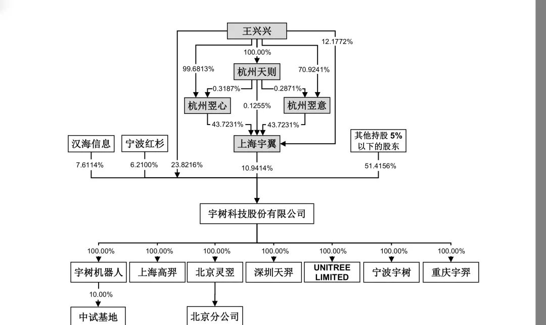 从股权结构来看,王兴兴直接持有公司8671.4964万股股份,占公司股本总额的23.8216%,系公司控股股东。同时,在表决权差异安排下,王兴兴直接持股部分的表决权比例为63.5457%,结合所控制的上海宇翼股权激励持股平台,合计控制的公司表决权比例为68.7816%。此外,宇树科技股东榜集聚了众多知名的创投机构等投资人。