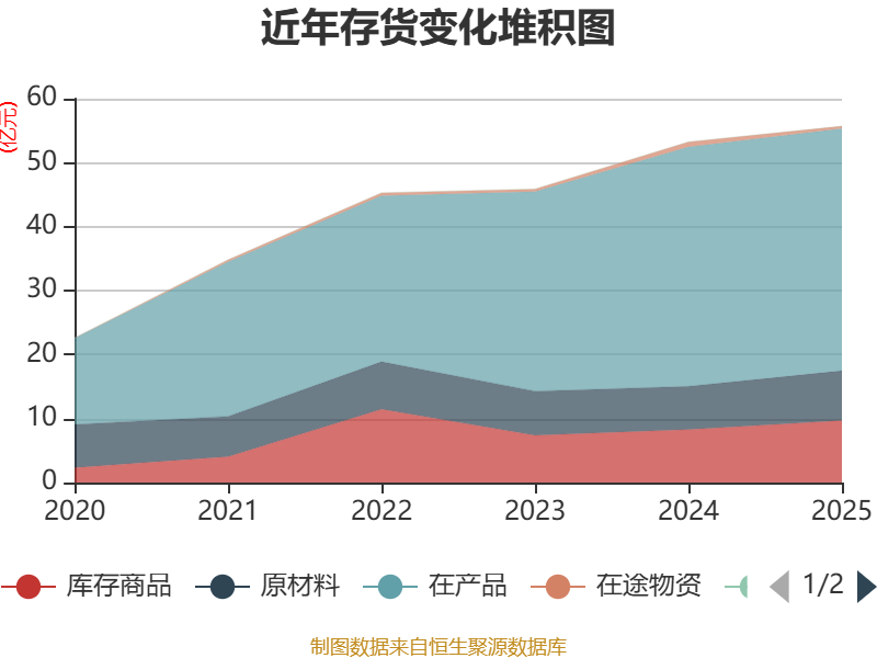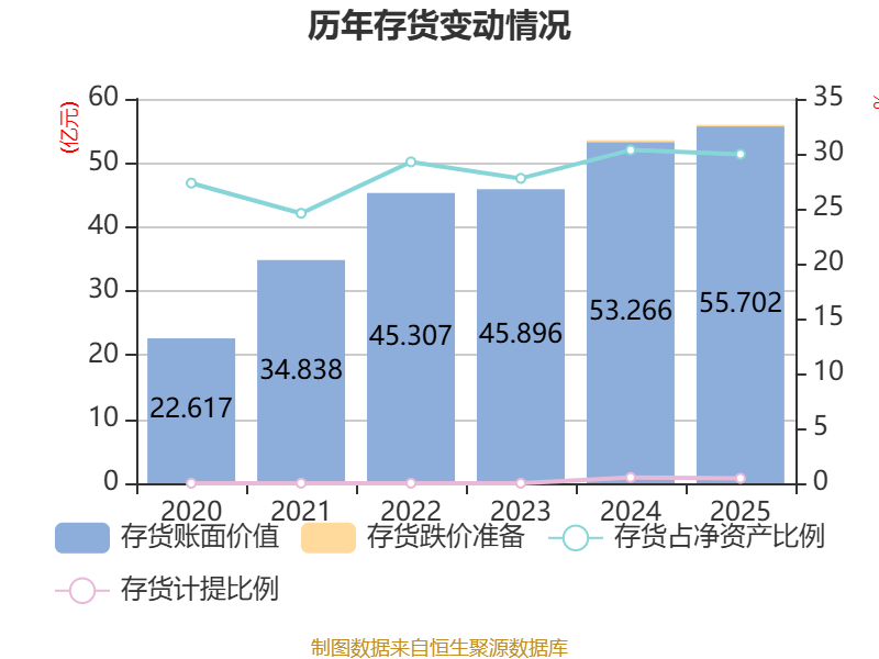 从存货变动来看,截至2025年末,公司存货账面价值为55.7亿元,占净资产的29.96%,较上年末增加2.44亿元。其中,存货跌价准备为2532.17万元,计提比例为0.45%。