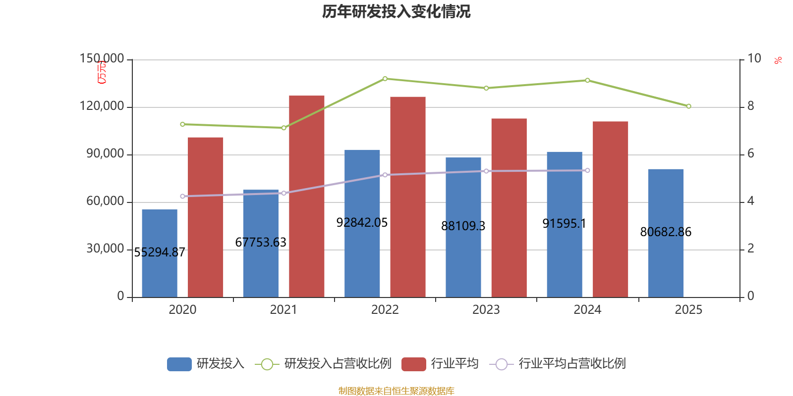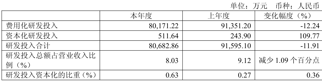 2025年全年,公司研发投入金额为8.07亿元,同比下降11.91%;研发投入占营业收入比例为8.03%,相比上年同期下降1.09个百分点。此外,公司全年研发投入资本化率为0.63%。