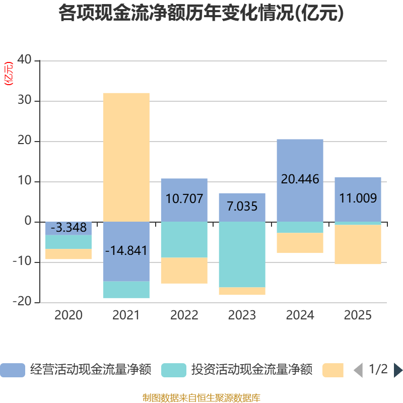 截至2025年,公司经营活动现金流净额为11.01亿元,同比下降46.15%;筹资活动现金流净额-9.7亿元,同比减少4.74亿元;投资活动现金流净额-8156.27万元,上年同期为-2.79亿元。