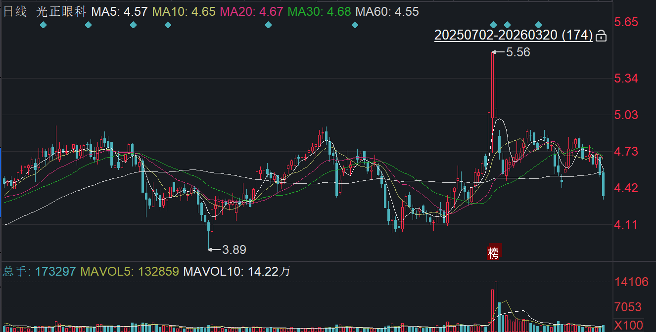 二级市场上,截至3月20日收盘,光正眼科下跌3.98%报4.34元/股,总市值约22.37亿元,近一年来公司股价近乎“原地踏步”。