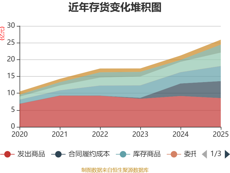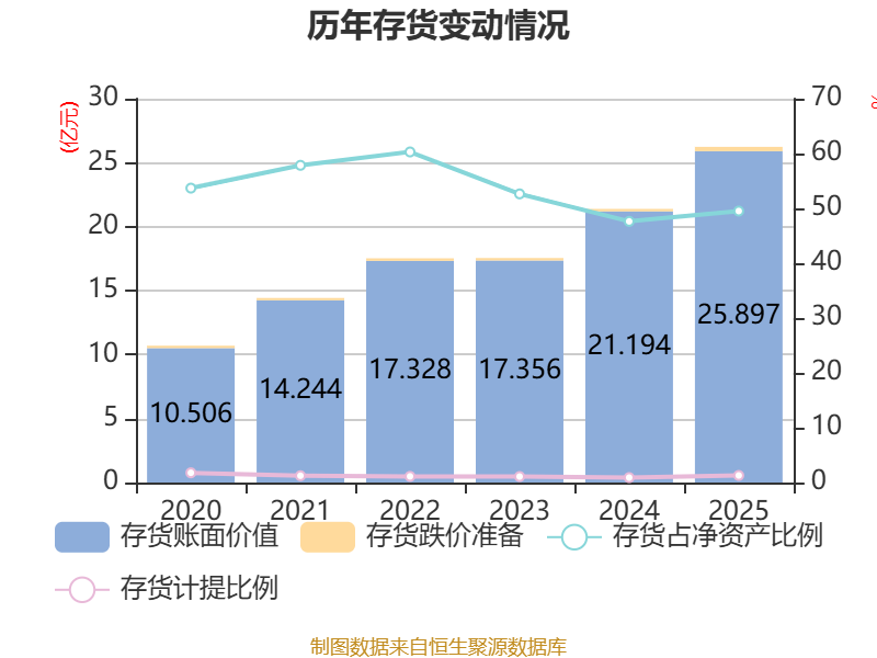 从存货变动来看,截至2025年末,公司存货账面价值为25.9亿元,占净资产的49.51%,较上年末增加4.7亿元。其中,存货跌价准备为3389.67万元,计提比例为1.29%。