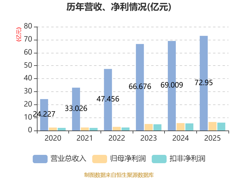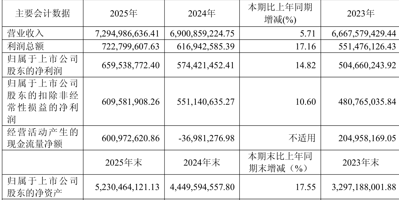 中证智能财讯金盘科技(688676)3月21日披露2025年年度报告。2025年,公司实现营业总收入72.95亿元,同比增长5.71%;归母净利润6.6亿元,同比增长14.82%;扣非净利润6.1亿元,同比增长10.60%;经营活动产生的现金流量净额为6.01亿元,上年同期为-3698.13万元;报告期内,金盘科技基本每股收益为1.44元,加权平均净资产收益率为14.05%。公司2025年度分配预案为:拟向全体股东每10股派现6.8元(含税)。