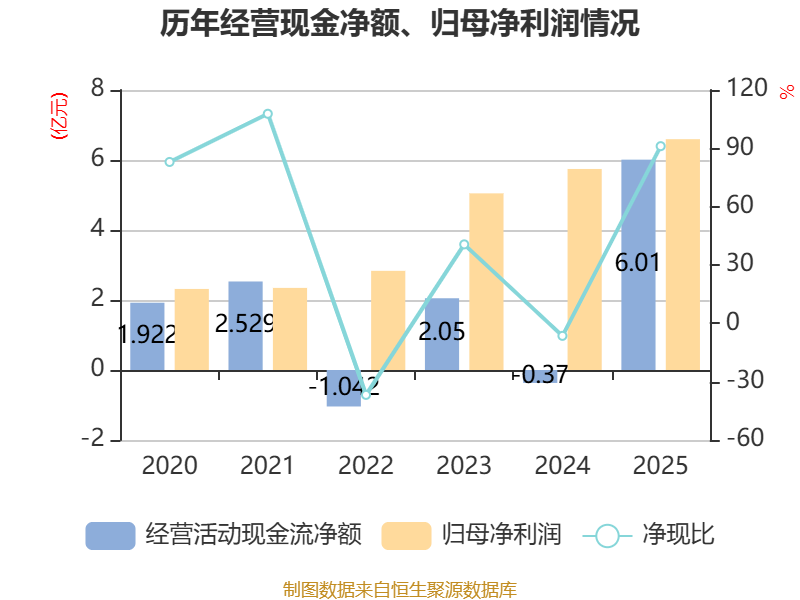 截至2025年,公司经营活动现金流净额为6.01亿元,同比增加6.38亿元;筹资活动现金流净额20.44亿元,同比增加18.01亿元;投资活动现金流净额-3.87亿元,上年同期为-4.38亿元。