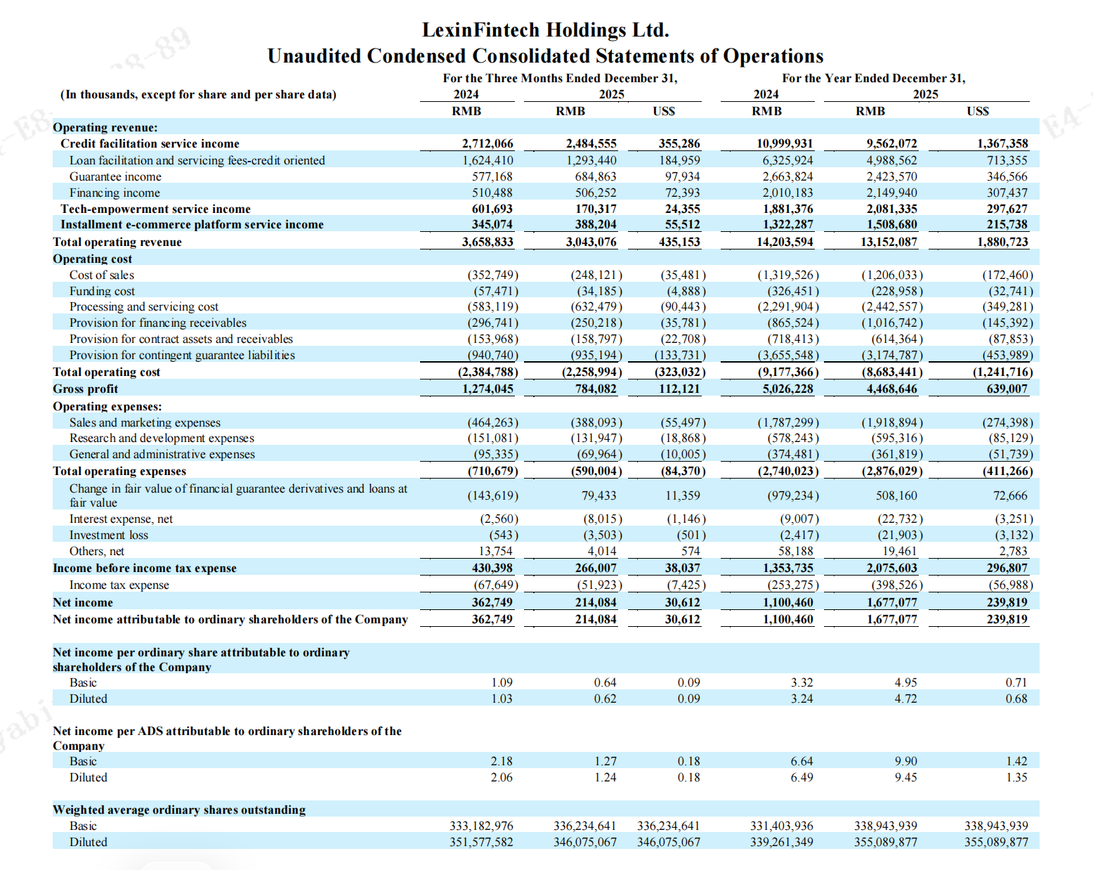 又一家金融科技企业交出年度财务答卷。在纳斯达克上市的中国领先新消费数字科技服务商乐信近日公布2025年第四季度及全年未经审计的财务报告。2025年全年,乐信总营收131.52亿元(人民币,下同),同比减少7.4%;归母净利润同比增长52.4%至16.77亿元,归属于普通股股东的调整后净利润同比增长49.2%至17.95亿元。