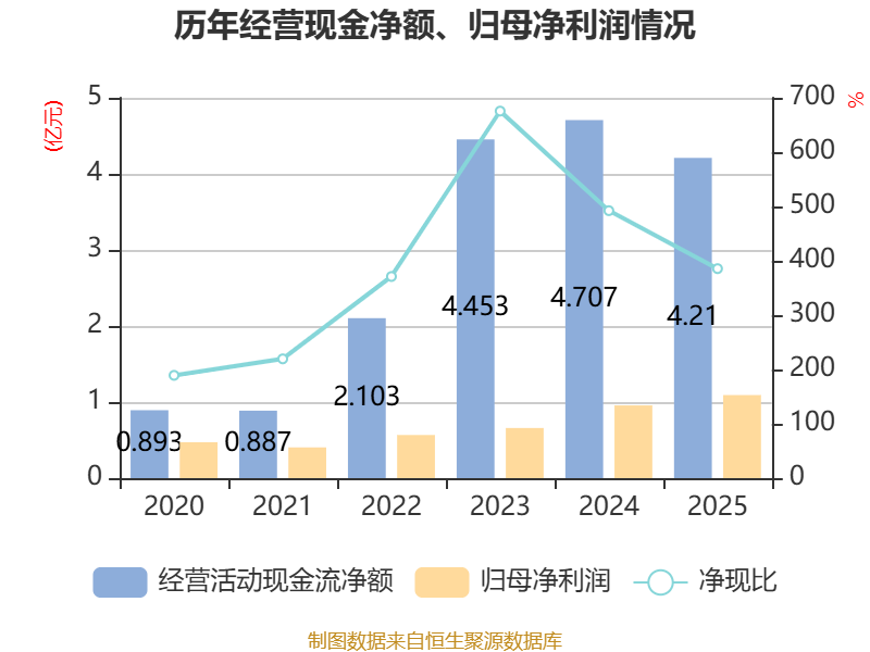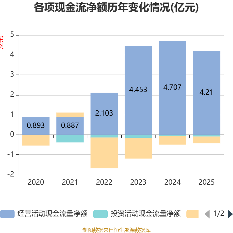 截至2025年,公司经营活动现金流净额为4.21亿元,同比下降10.55%;筹资活动现金流净额-3415.51万元,同比增加772.51万元;投资活动现金流净额-847.57万元,上年同期为-731.27万元。