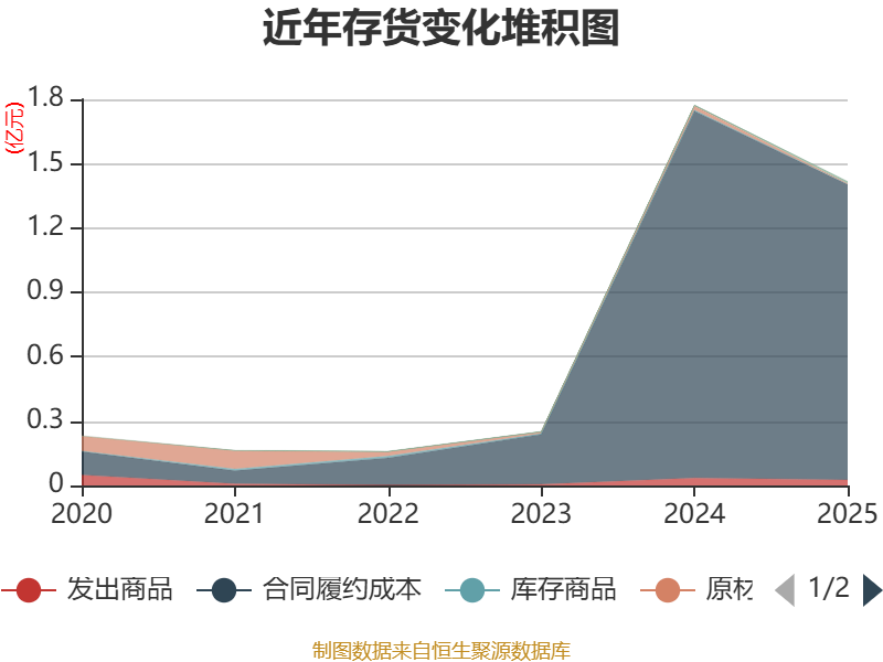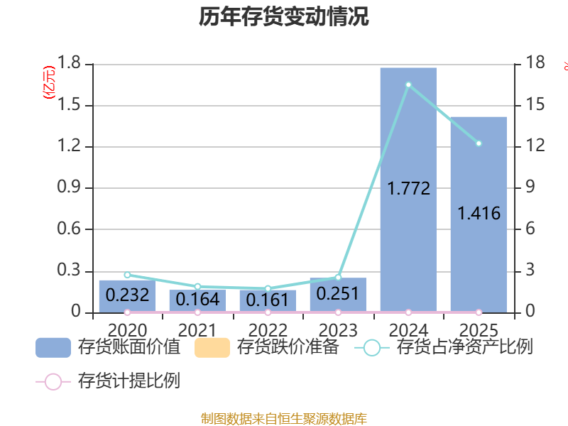 从存货变动来看,截至2025年末,公司存货账面价值为1.42亿元,占净资产的12.24%,较上年末减少3557.22万元。公司本期没有计提存货跌价准备。