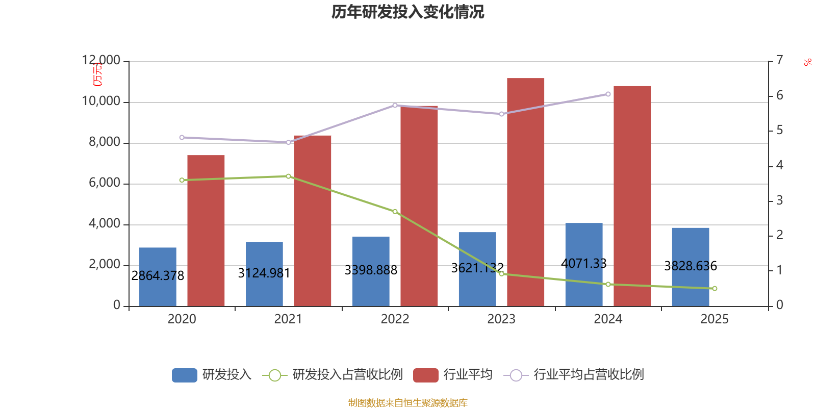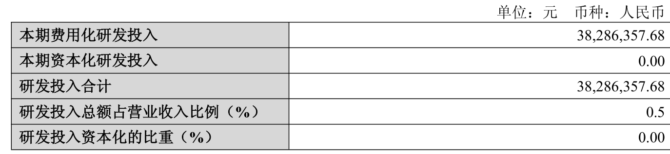 2025年全年,公司研发投入金额为3828.64万元,同比下降5.96%;研发投入占营业收入比例为0.5%,相比上年同期下降0.12个百分点。此外,公司全年研发投入资本化率为0%。