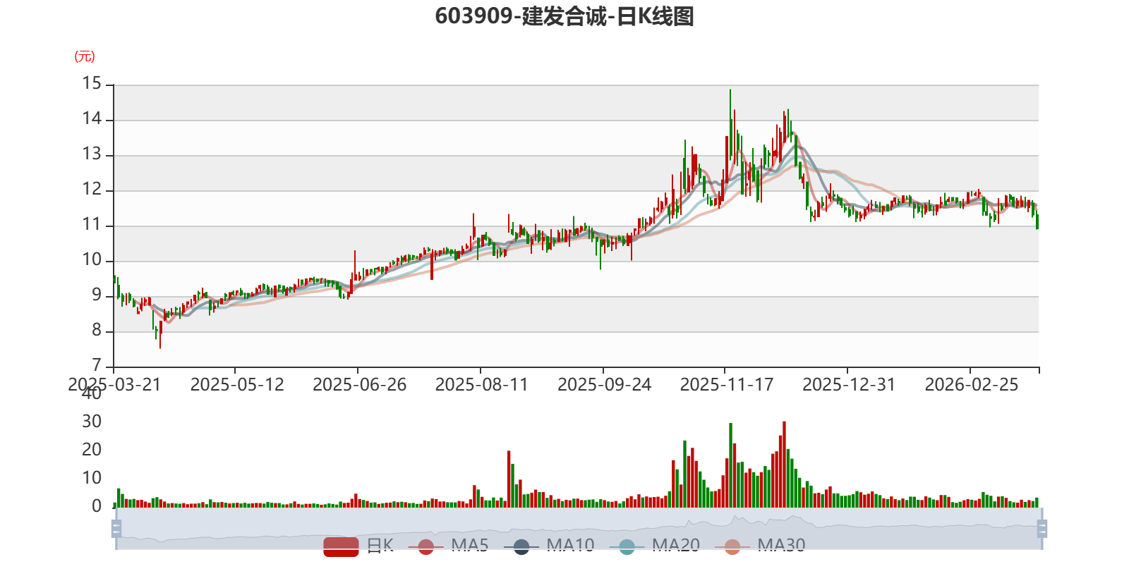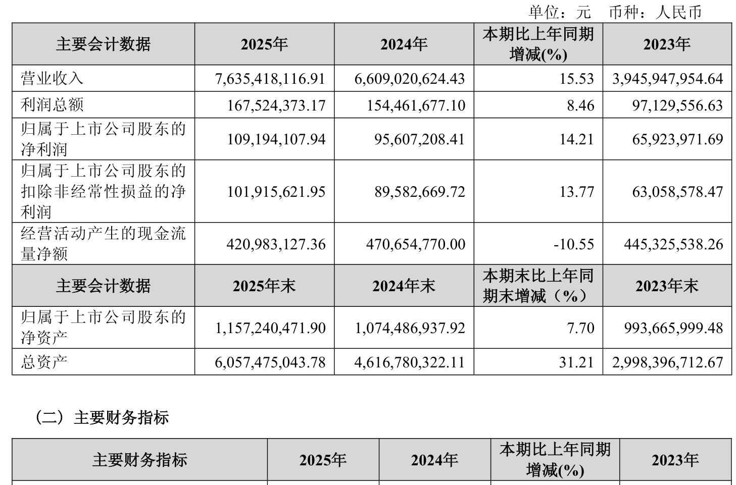 中证智能财讯建发合诚(603909)3月21日披露2025年年度报告。2025年,公司实现营业总收入76.35亿元,同比增长15.53%;归母净利润1.09亿元,同比增长14.21%;扣非净利润1.02亿元,同比增长13.77%;经营活动产生的现金流量净额为4.21亿元,同比下降10.55%;报告期内,建发合诚基本每股收益为0.4189元,加权平均净资产收益率为9.81%。公司2025年度分配预案为:拟向全体股东每10股派现1.5元(含税)。