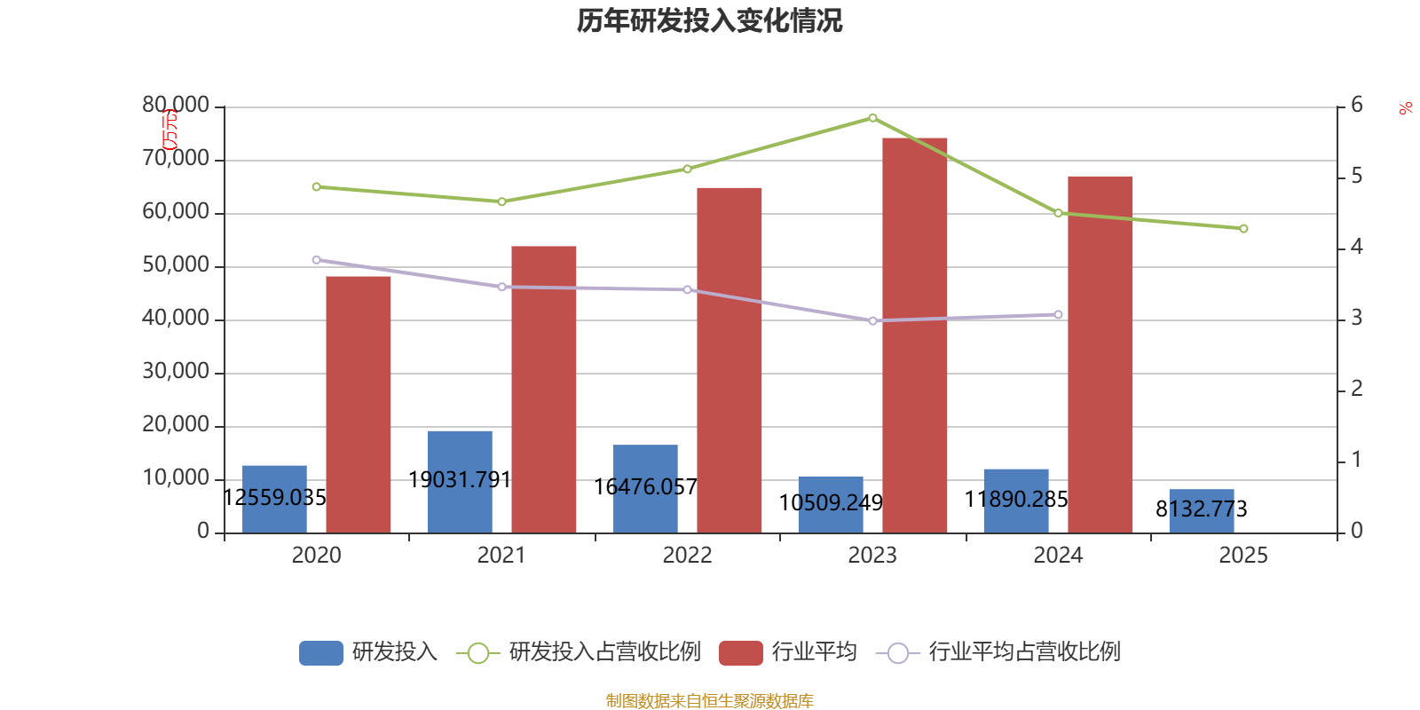 2025年全年,公司研发投入金额为8132.77万元,同比下降31.6%;研发投入占营业收入比例为4.28%,相比上年同期下降0.22个百分点。此外,公司全年研发投入资本化率为0%。