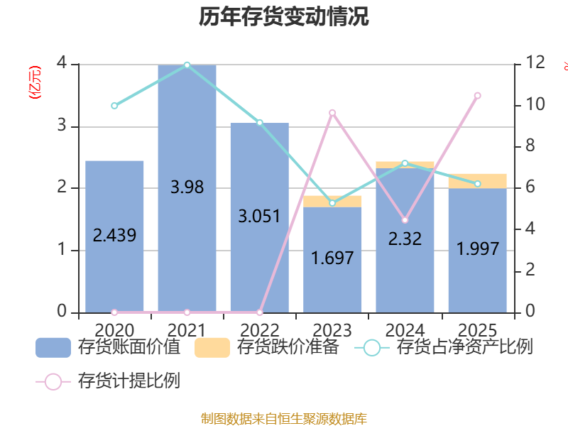 从存货变动来看,截至2025年末,公司存货账面价值为2亿元,占净资产的6.21%,较上年末减少3231.45万元。其中,存货跌价准备为2334.63万元,计提比例为10.47%。