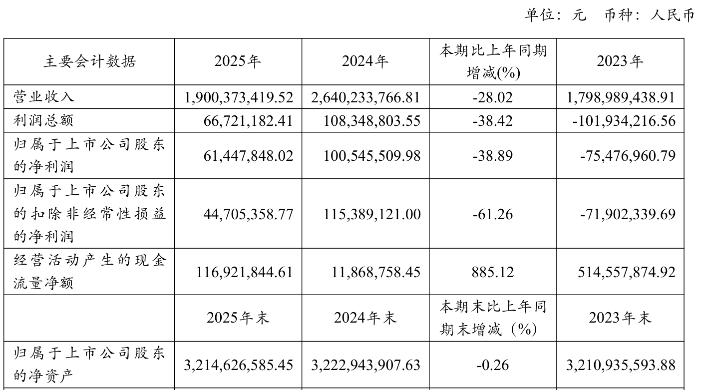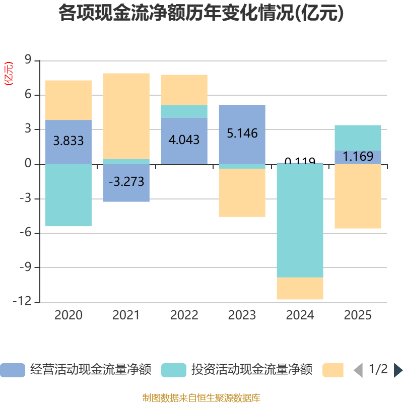 截至2025年,公司经营活动现金流净额为1.17亿元,同比增长885.12%;筹资活动现金流净额-5.59亿元,同比减少3.69亿元;投资活动现金流净额2.21亿元,上年同期为-9.85亿元。