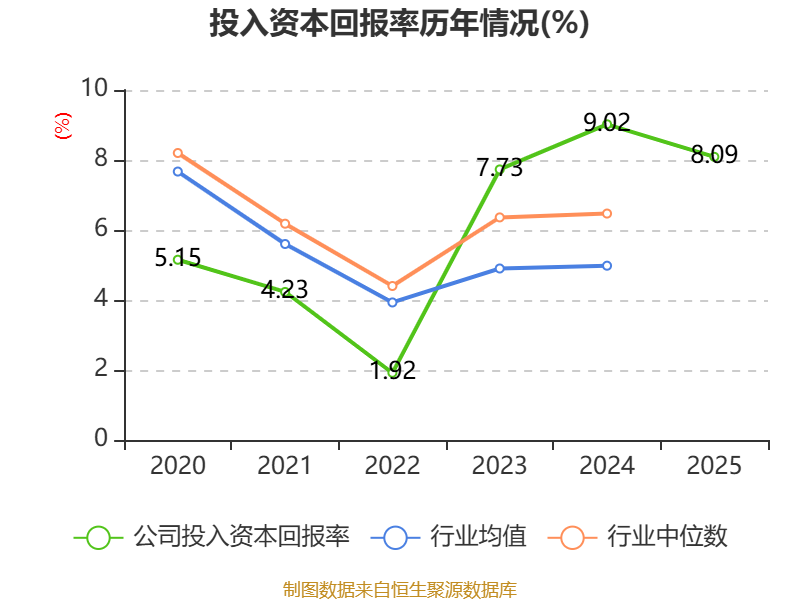数据显示,2025年公司加权平均净资产收益率为9.28%,较上年同期下降0.76个百分点。公司2025年投入资本回报率为8.09%,较上年同期下降0.93个百分点。