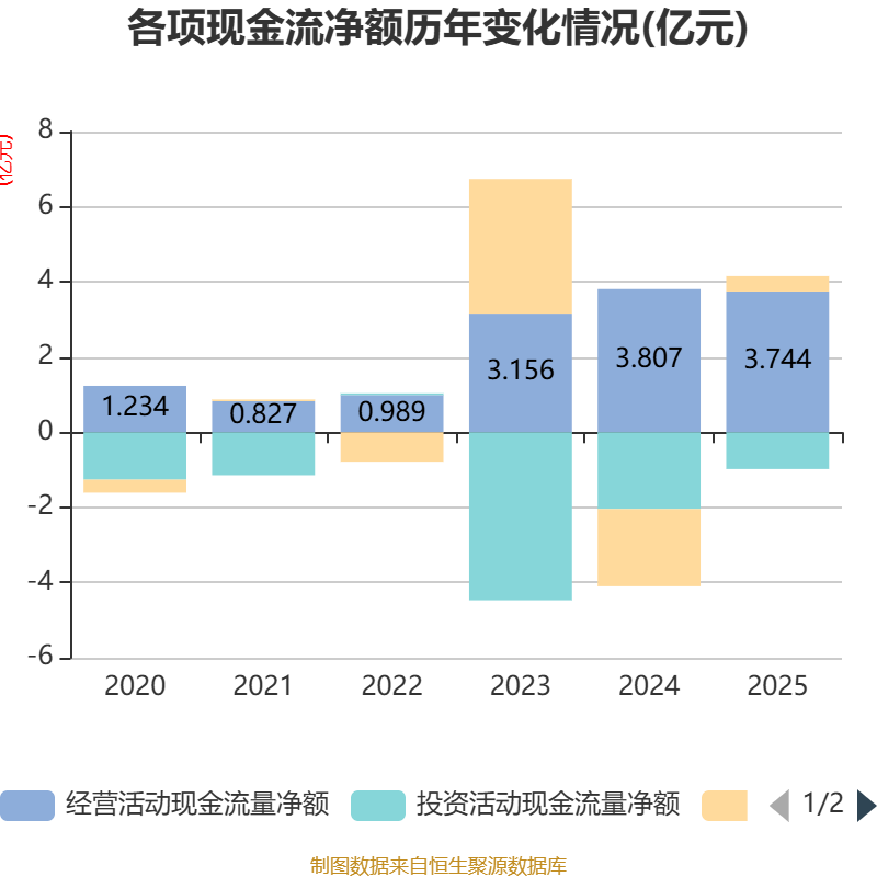 截至2025年,公司经营活动现金流净额为3.74亿元,同比下降1.67%;筹资活动现金流净额4093.33万元,同比增加2.47亿元;投资活动现金流净额-9799.59万元,上年同期为-2.04亿元。