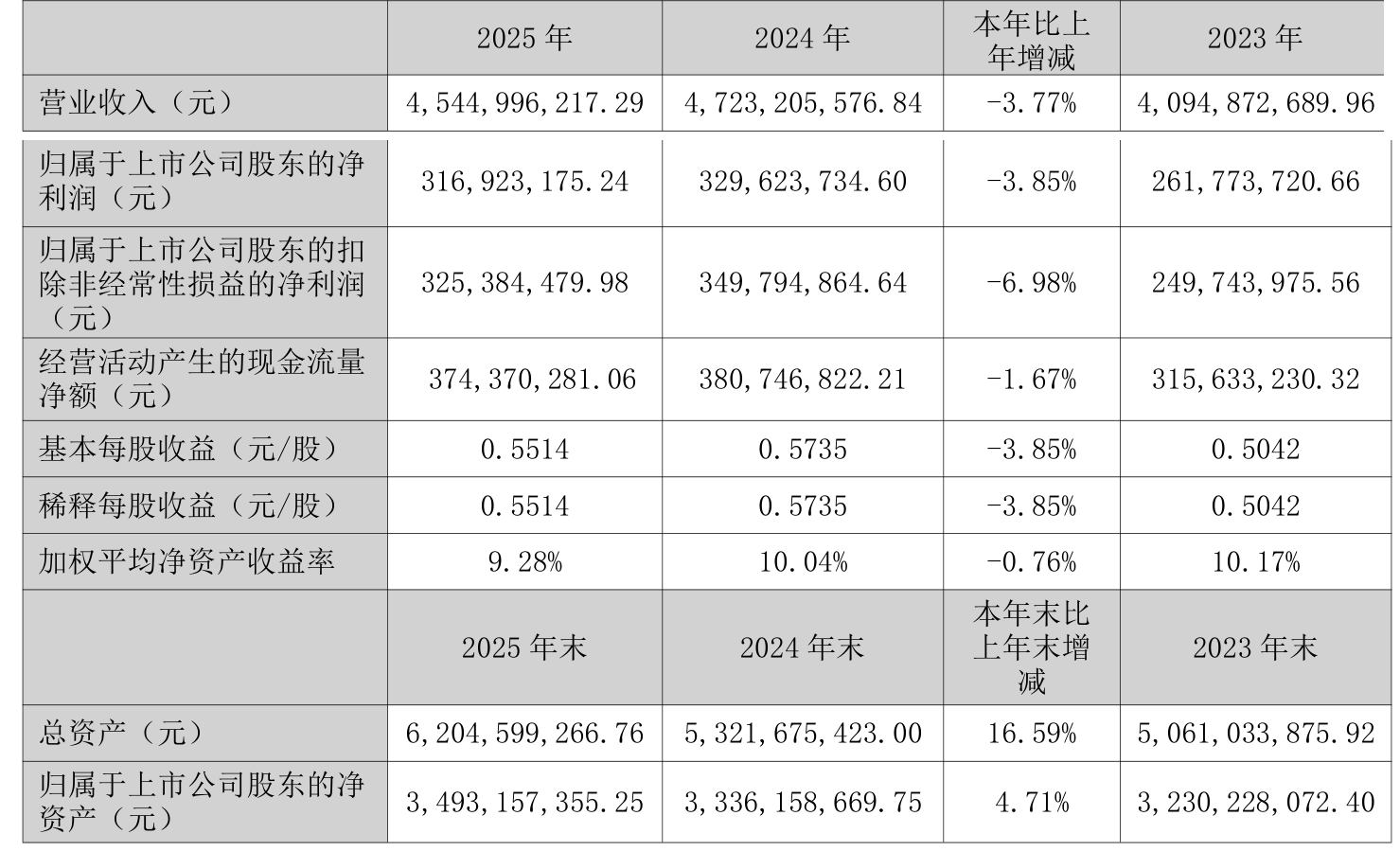 中证智能财讯飞龙股份(002536)3月20日披露2025年年度报告。2025年,公司实现营业总收入45.45亿元,同比下降3.77%;归母净利润3.17亿元,同比下降3.85%;扣非净利润3.25亿元,同比下降6.98%;经营活动产生的现金流量净额为3.74亿元,同比下降1.67%;报告期内,飞龙股份基本每股收益为0.5514元,加权平均净资产收益率为9.28%。公司2025年度分配预案为:拟向全体股东每10股派现3元(含税)。