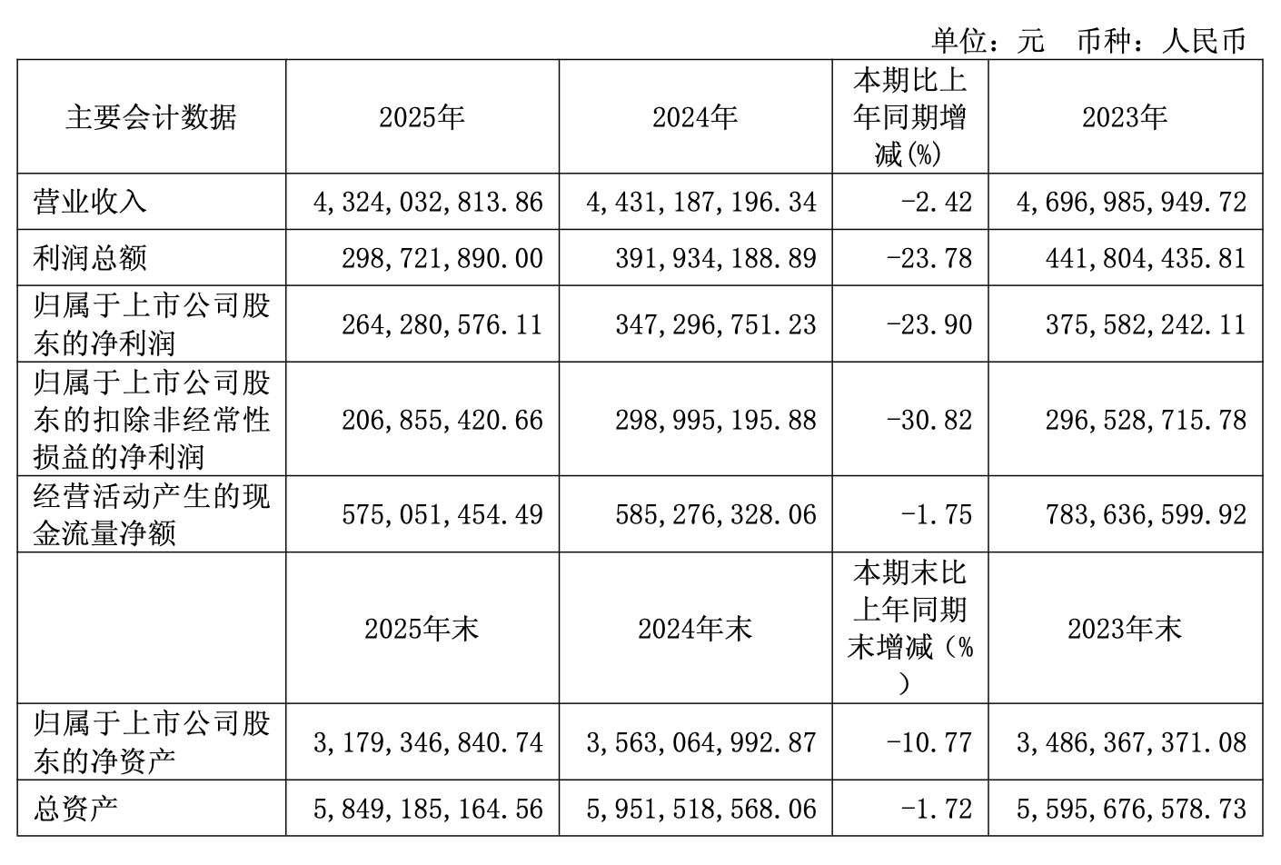 3月20日,得邦照明(603303)公布2025年年报,公司营业收入实现43.24亿元,同比下降2.42%;归母净利润实现2.64亿元,同比下降23.90%。