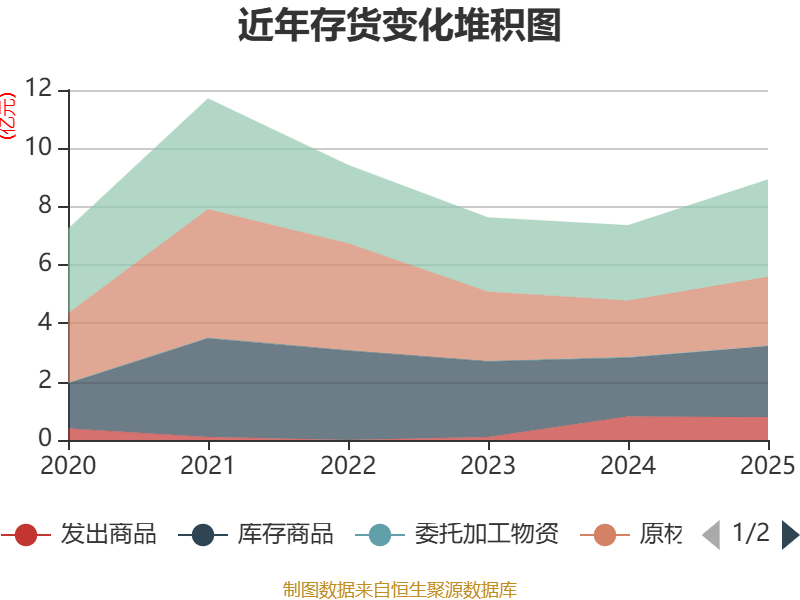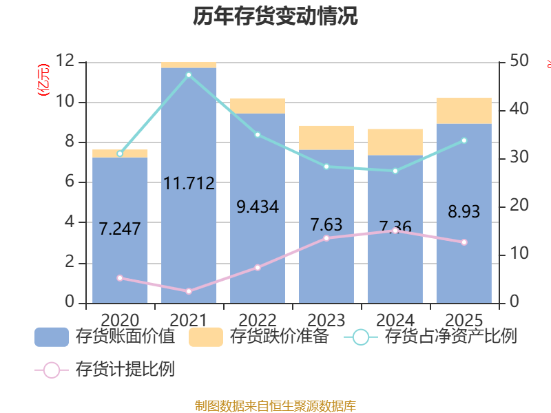 从存货变动来看,截至2025年末,公司存货账面价值为8.93亿元,占净资产的33.7%,较上年末增加1.57亿元。其中,存货跌价准备为1.29亿元,计提比例为12.58%。