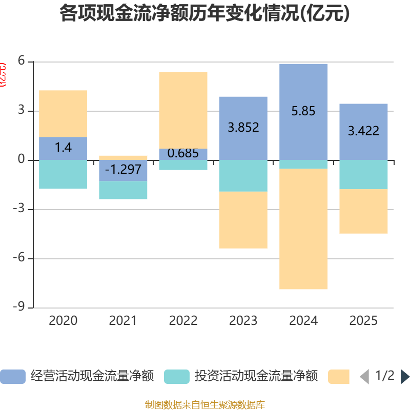 截至2025年,公司经营活动现金流净额为3.42亿元,同比下降41.5%;筹资活动现金流净额-2.71亿元,同比增加4.64亿元;投资活动现金流净额-1.79亿元,上年同期为-5438.94万元。