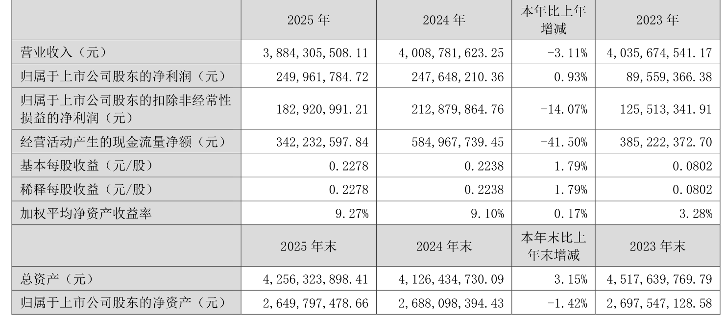 中证智能财讯英洛华(000795)3月21日披露2025年年度报告。2025年,公司实现营业总收入38.84亿元,同比下降3.11%;归母净利润2.5亿元,同比增长0.93%;扣非净利润1.83亿元,同比下降14.07%;经营活动产生的现金流量净额为3.42亿元,同比下降41.50%;报告期内,英洛华基本每股收益为0.2278元,加权平均净资产收益率为9.27%。公司2025年度分配预案为:拟向全体股东每10股派现1.25元(含税)。