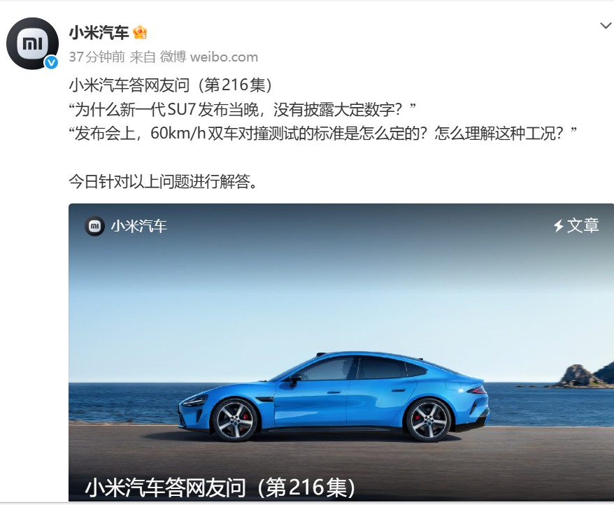 【大河财立方消息】3月20日,有网友提问:为什么新一代SU7发布当晚,没有披露大定数据?对此,小米汽车回应:新一代SU7,从开售到现在,“锁单”进展一直比第一代更好。本次发布会当晚没有公布“大定”数据,而是直接公布了“锁单”数据。实际上,从去年6月YU7发布后的第二天开始,小米汽车就选择了公布“锁单”量,而非“大定”量。因为,不可退的“锁单”数据更能真实、客观地反映用户的选择与认可。