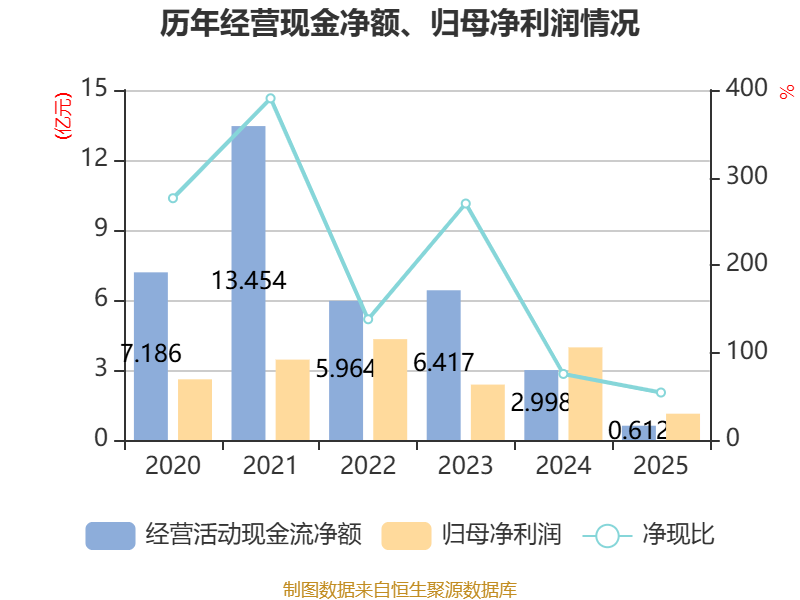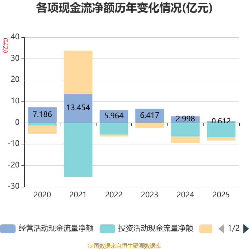 截至2025年,公司经营活动现金流净额为6116.27万元,同比下降79.6%;筹资活动现金流净额-1.55亿元,同比增加1.48亿元;投资活动现金流净额-6.81亿元,上年同期为-6.48亿元。