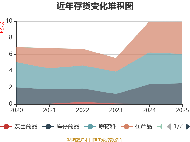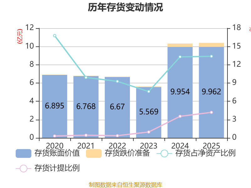 从存货变动来看,截至2025年末,公司存货账面价值为9.96亿元,占净资产的13.39%,较上年末增加77.52万元。其中,存货跌价准备为4355.98万元,计提比例为4.19%。