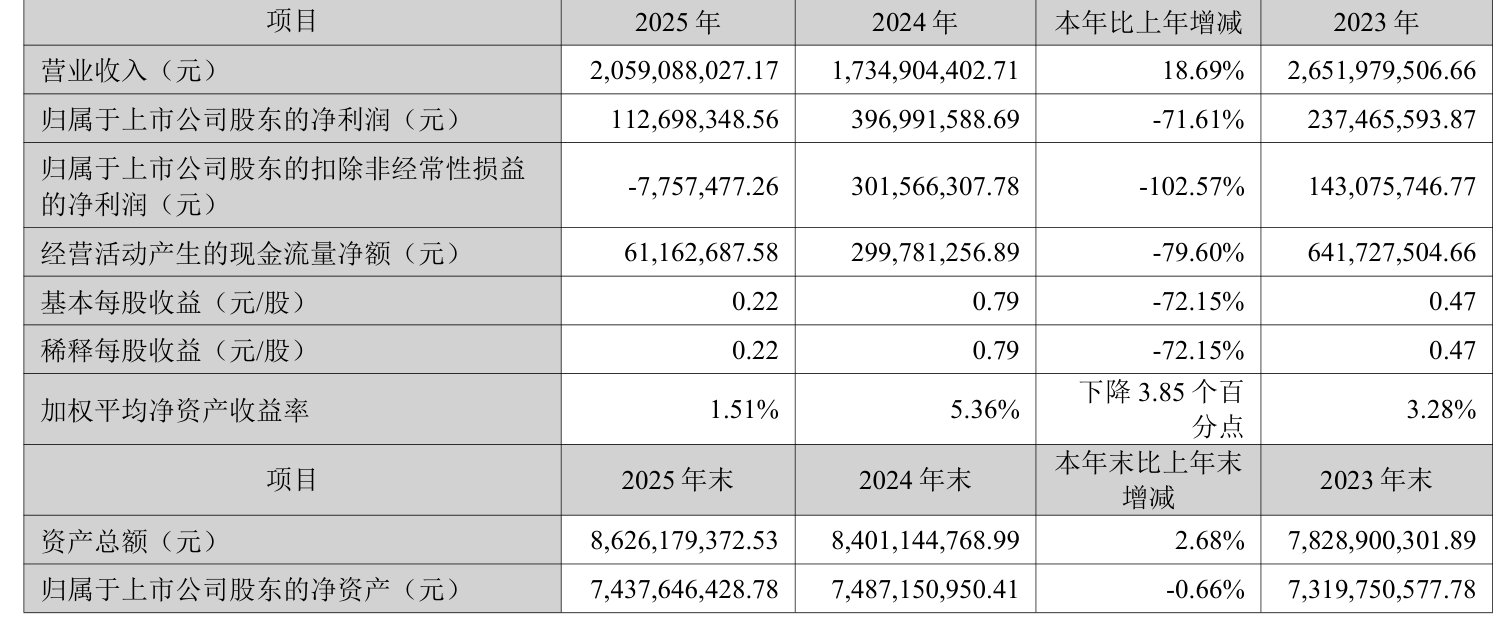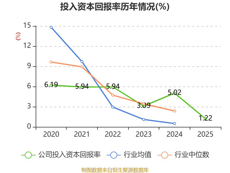 数据显示,2025年公司加权平均净资产收益率为1.51%,较上年同期下降3.85个百分点。公司2025年投入资本回报率为1.22%,较上年同期下降3.8个百分点。