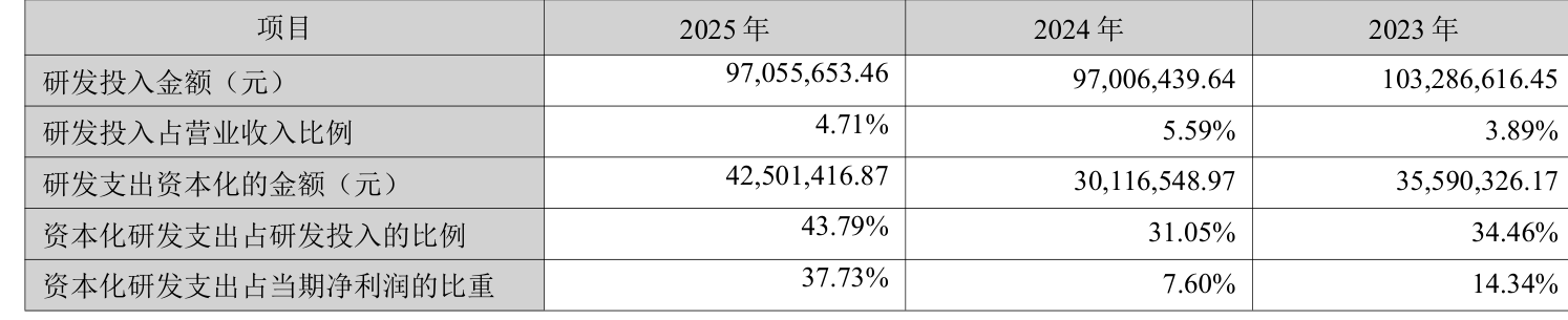 2025年全年,公司研发投入金额为9705.57万元,同比增长0.05%;研发投入占营业收入比例为4.71%,相比上年同期下降0.88个百分点。此外,公司全年研发投入资本化率为43.79%。