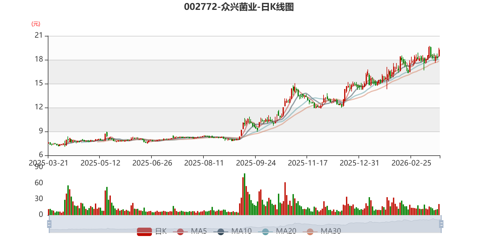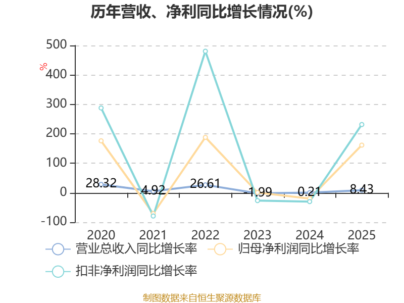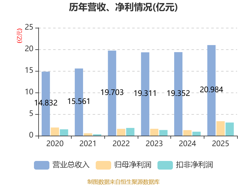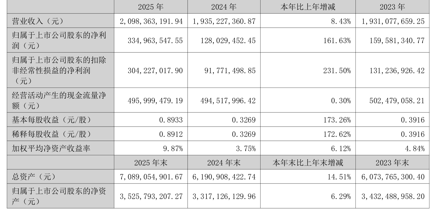 中证智能财讯众兴菌业(002772)3月21日披露2025年年度报告。2025年,公司实现营业总收入20.98亿元,同比增长8.43%;归母净利润3.35亿元,同比增长161.63%;扣非净利润3.04亿元,同比增长231.50%;经营活动产生的现金流量净额为4.96亿元,同比增长0.30%;报告期内,众兴菌业基本每股收益为0.8933元,加权平均净资产收益率为9.87%。公司2025年度分配预案为:拟向全体股东每10股派现3元(含税)。