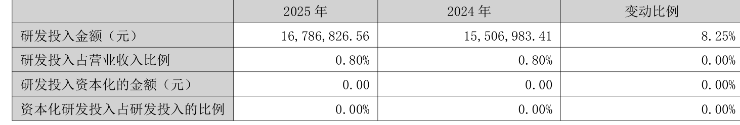 2025年全年,公司研发投入金额为1678.68万元,同比增长8.25%;研发投入占营业收入比例为0.8%,相比上年同期持平。此外,公司全年研发投入资本化率为0%。