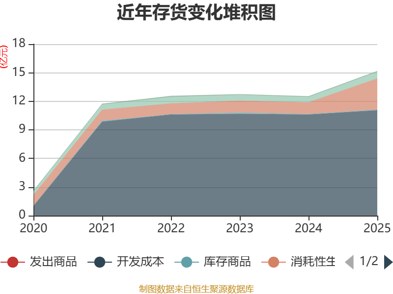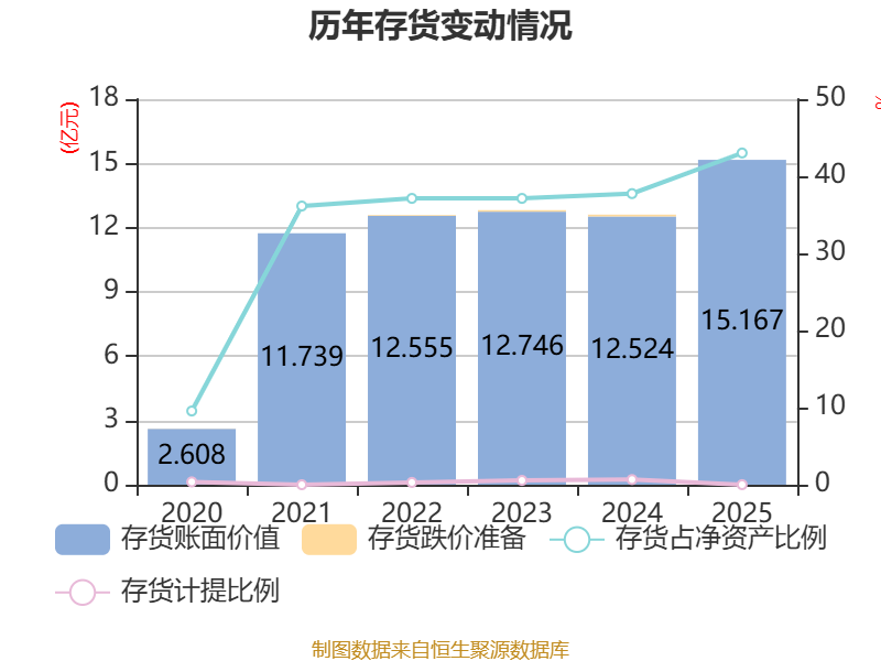 从存货变动来看,截至2025年末,公司存货账面价值为15.17亿元,占净资产的43.02%,较上年末增加2.64亿元。其中,存货跌价准备为11.16万元,计提比例为0.01%。
