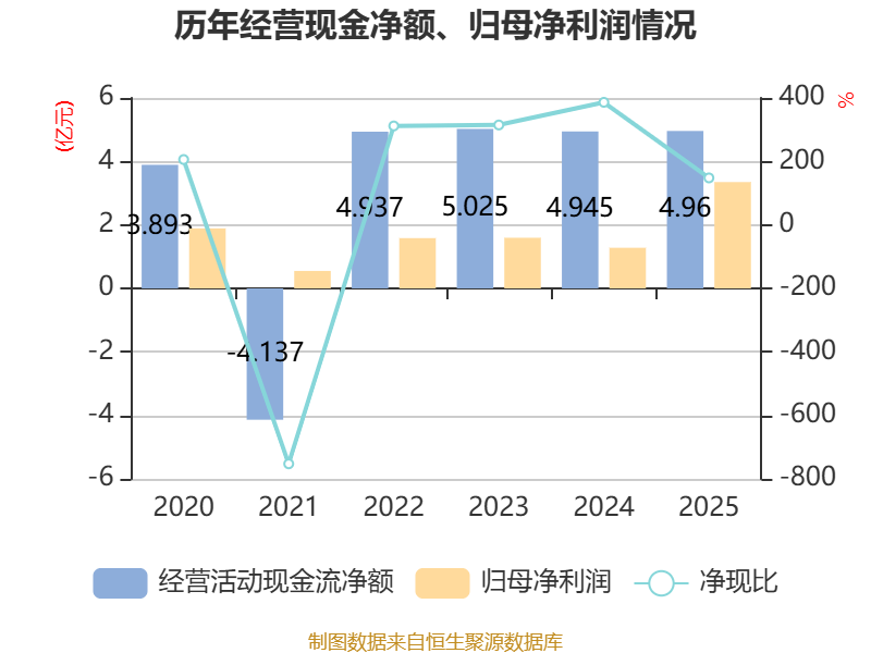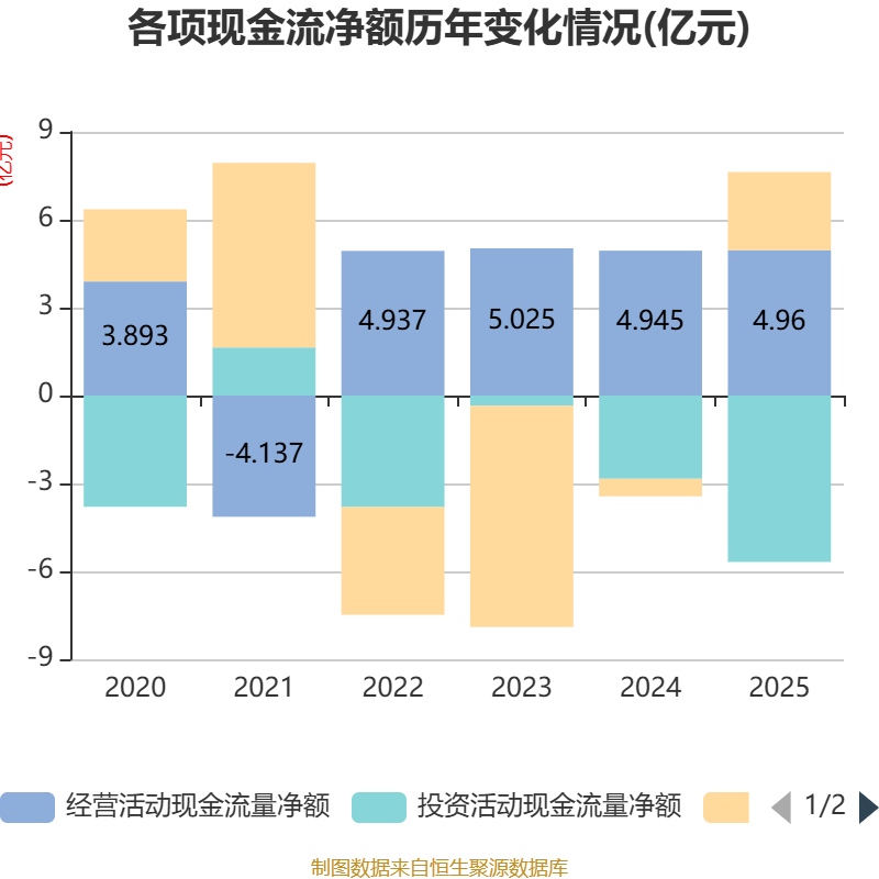 截至2025年,公司经营活动现金流净额为4.96亿元,同比增长0.3%;筹资活动现金流净额2.67亿元,同比增加3.27亿元;投资活动现金流净额-5.68亿元,上年同期为-2.84亿元。