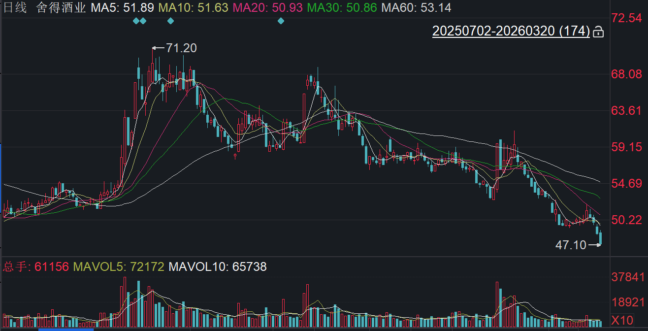 二级市场上,截至3月20日收盘,舍得酒业下跌2.62%报47.15元/股,总市值约156.90亿元,近一年来公司股价累计下跌约两成。