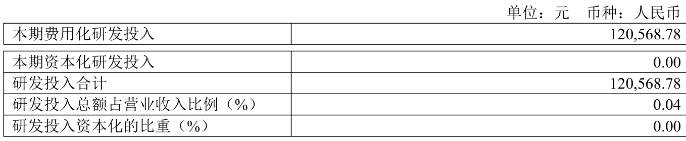 2025年全年,公司研发投入金额为12.06万元,同比下降73.84%;研发投入占营业收入比例为0.04%,相比上年同期下降0.07个百分点。此外,公司全年研发投入资本化率为0%。