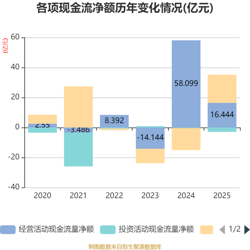 截至2025年,公司经营活动现金流净额为16.44亿元,同比下降71.7%;筹资活动现金流净额18.73亿元,同比增加33.43亿元;投资活动现金流净额-2.92亿元,上年同期为-3747.9万元。