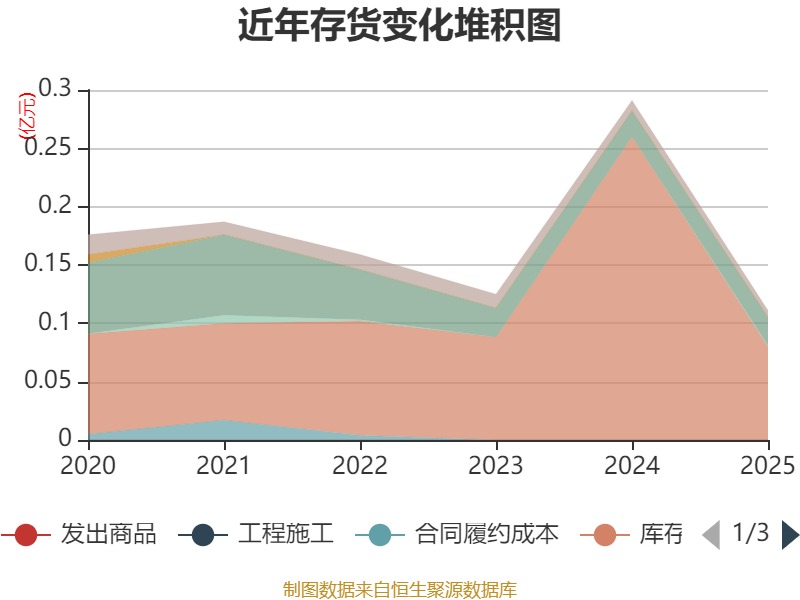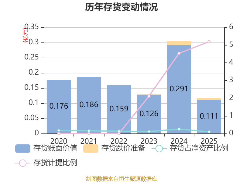 从存货变动来看,截至2025年末,公司存货账面价值为1108.16万元,占净资产的0.09%,较上年末减少1798.01万元。其中,存货跌价准备为60.69万元,计提比例为5.19%。