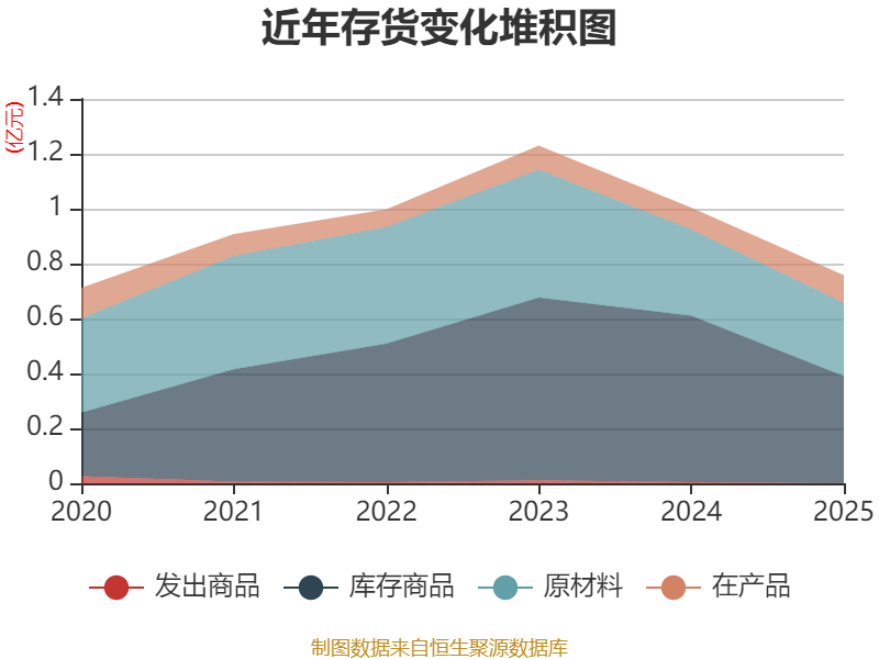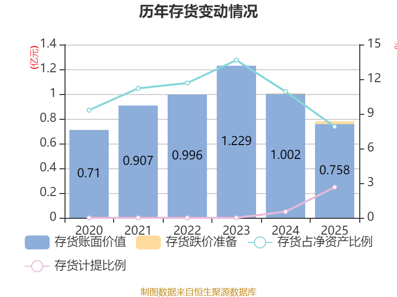 从存货变动来看,截至2025年末,公司存货账面价值为7575.95万元,占净资产的7.89%,较上年末减少2443.89万元。其中,存货跌价准备为206.47万元,计提比例为2.65%。