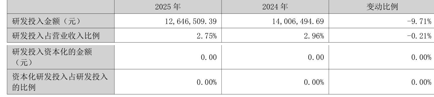 2025年全年,公司研发投入金额为1264.65万元,同比下降9.71%;研发投入占营业收入比例为2.75%,相比上年同期下降0.21个百分点。此外,公司全年研发投入资本化率为0%。