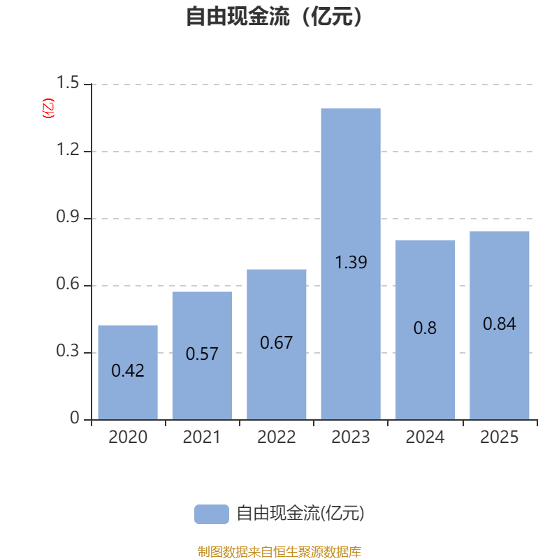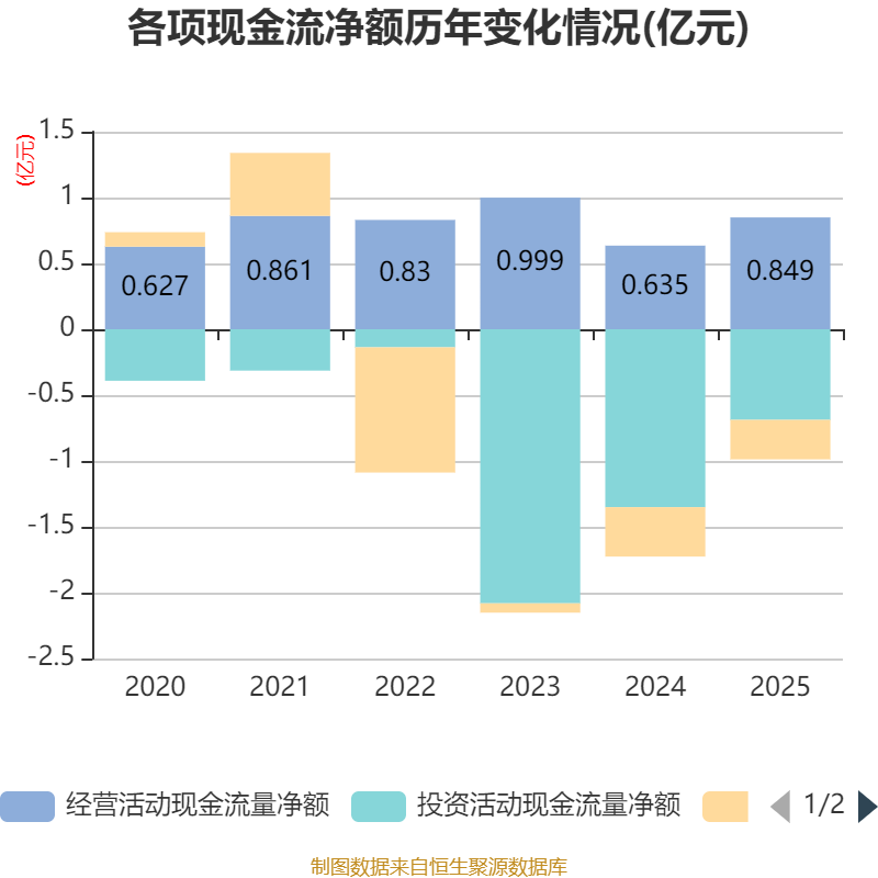 截至2025年,公司经营活动现金流净额为8489.4万元,同比增长33.67%;筹资活动现金流净额-2996.79万元,同比增加749.84万元;投资活动现金流净额-6881.22万元,上年同期为-1.35亿元。