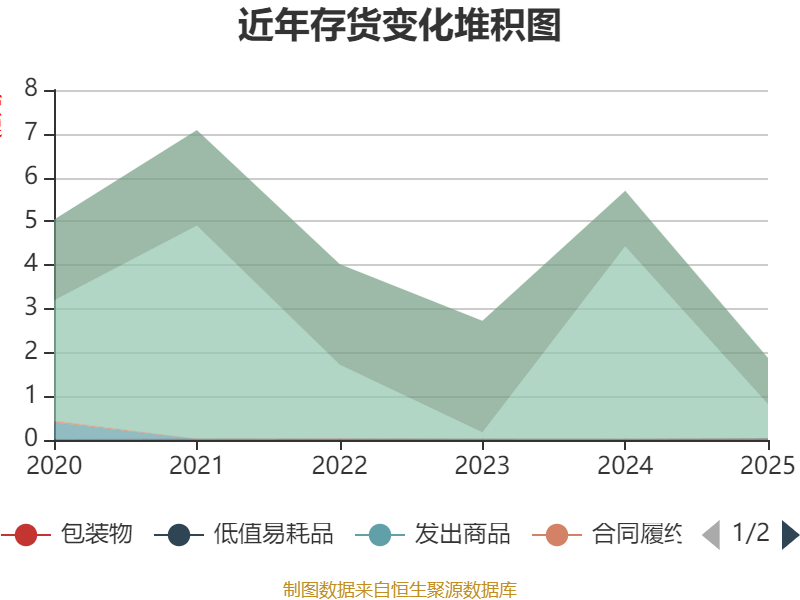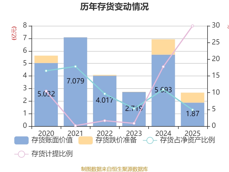 从存货变动来看,截至2025年末,公司存货账面价值为1.87亿元,占净资产的4.88%,较上年末减少3.82亿元。其中,存货跌价准备为8004.36万元,计提比例为29.97%。